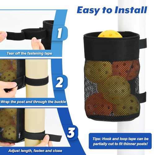 DUAL WRAP-AROUND FASTENING DESIGN – Our pickleball ball pouch comes with two hook and loop tapes, they have strong grip and adhesive, you can adjust the length through the buckle to apply to different sizes of posts, easy to remove and install, quickly hold the pickleball ball bag in place.