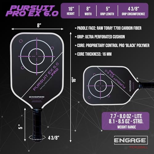 Engage Pursuit Pro EX 6.0 Pickleball Paddle – Widebody Shape, Raw T700 Toray Carbon Fiber Face, 16mm Control Pro Black Core (Deep Magenta, Standard (8.1-8.5oz))