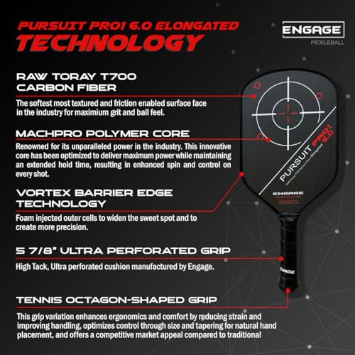 Engage Pursuit Pro1 6.0 Elongated Carbon Fiber Pickleball Paddle, Designed not to replace the ever-popular Pursuit Pro, but rather provide an option for players who find themselves searching for advancement, the Engage Pursuit Pro1 6.0 Elongated Pickleball Paddle brings a slightly changed shape and more to the Pursuit line. The new shape found in the Pro1 line focuses on maximizing swing speed and hand speed through aerodynamics so that you can achieve spin, power, and reach without giving up the control provided by the 16mm MachPro Core. This proprietary core works to provide the dwell time you need for a controllable soft feel and plenty of spin, without limiting rebound that leads to poppy power. Speaking of power, unique to the Pro1 is Variable Release 2.0 technology that offers more flex, meaning the faster you swing this paddle, the more it flexes and snaps into the ball for unparalleled put aways.While the new technology found in the 16.5” Pursuit Pro1 6.0 Elongated Paddle from Engage certainly caught our attention, we were excited to see the return of the Raw Toray T700 Carbin Fiber hitting surface. Measuring in at 7.5” wide, this hitting surface boasts a natural texture that grips the ball as it lingers for dominant spin potential. Also back is the close-to-the-hand counterbalance technology, vibration-eating uniform guard technology, and the stability of foam reinforcement thanks to the Vortex Barrier Edge.