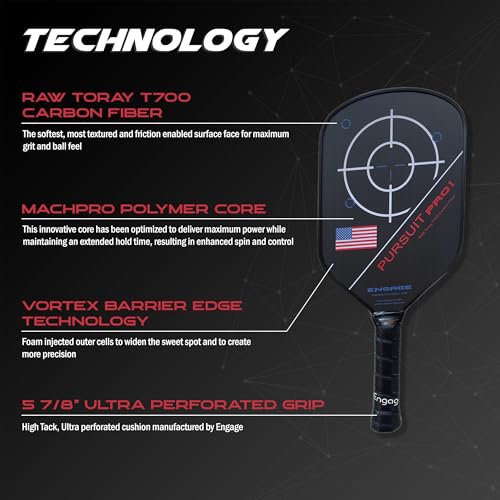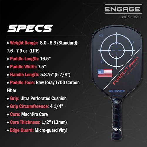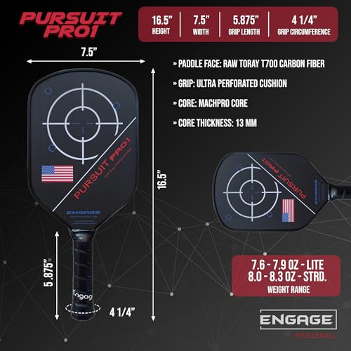 Engage Pursuit Pro1 Pickleball Paddle – Raw T700 Toray Carbon Fiber for Extreme Spin – MachPro Core for Maximum Power & Control (Red-White-Blue, Light Weight (7.6-7.9oz))