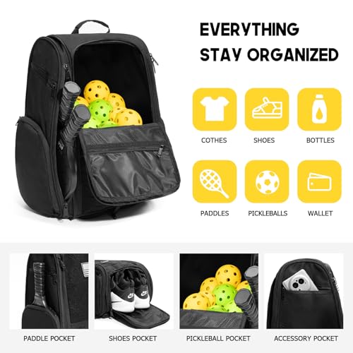 Convenient storage:This large backpack for pickleball effortlessly holds all your pickleball gear, including paddles, , clothes, shoes, pickleball ballswallet, keys, and related accessories. Can be neatly organised in a backpack.