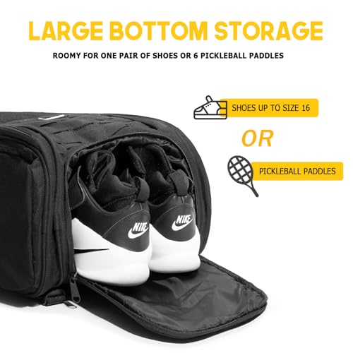 capacity expansion:FITS 4 TO 8 PADDLES – Saboos pickle ball bag features one separate paddle compartment for 4 pickleball paddles. Ventilated large bottom storage is spacious enough for shoes up to size 16, or 6 pickleball paddles when not used for shoes.