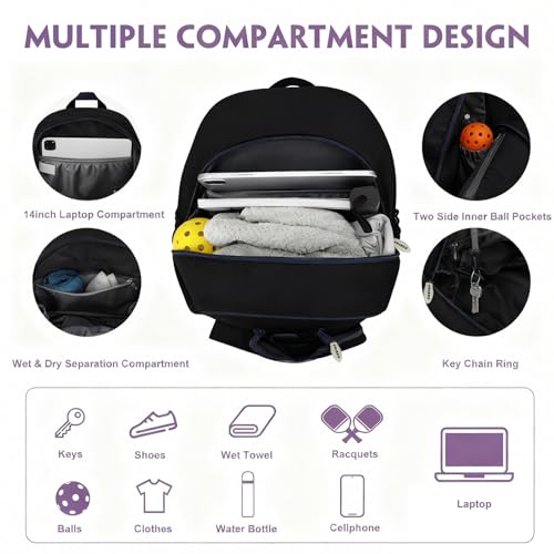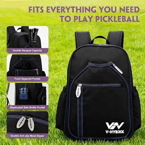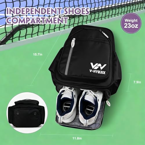 【SPACIOUS & ORGANIZED】- VHYBRIX pickleball backpack designed with a padded racket-shaped compartment to separately hold and protect pickleball paddles well, a thermal-insulated pocket, and a separate ventilated shoe compartment.Multiple compartments with zipper closures provide organized storage. Keep all your gear neatly stored and easily accessible.