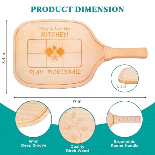 【Durable and High-Quality Construction】Crafted from durable birch wood, this pickleball charcuterie board is built to last. The deep juice grooves keep your counter clean even as you serve, and the round sturdy care for makes it easy to carry around.