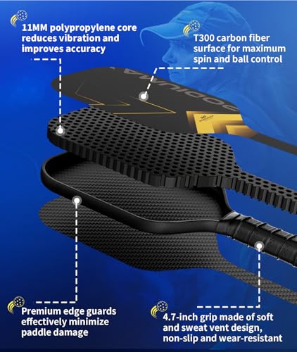 Professional Paddles for Training Court: The carbon fiber pickleball paddle designed for starting to play pickleball, the 11mm ultra-thin polypropylene honeycomb core provides excellent ball Regulate feel to help young players master their hitting skills quickly. The stability of the T300 carbon fiber surface allows for more precision with each and every swing, whether pickleball paddle is on the practice court or at the neighborhood park
