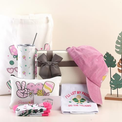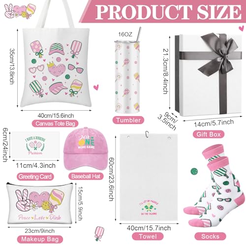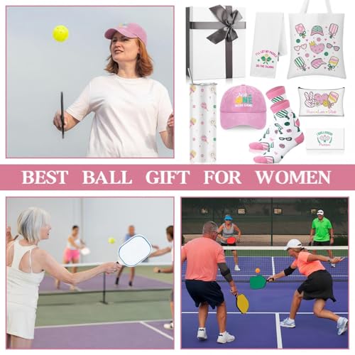 Complete Dink Ball Gift Set: this dink ball gift for women includes 1 pcs insulated tumbler, 1 pair of novelty socks, 1 pcs canvas tote bag, 1 pcs cosmetic bag, 1 pcs towel, 1 pcs hat, 1 pcs greeting card, all packed in a gift box; For anyone who loves dink ball, this set brings genuine joy, covering daily use and decorative needs at the same time as highlighting their passion for the sport; It’s a thoughtful collection that sticks out as practical dink lover gifts