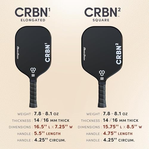 Updated Design: The CRBN² Pickleball Paddle features the same carbon fiber face and honeycomb core as the CRBN¹, but now with a shorter handle, and a shorter, wider face than the CRBN¹. The result is a wider sweet spot instead of a longer one.