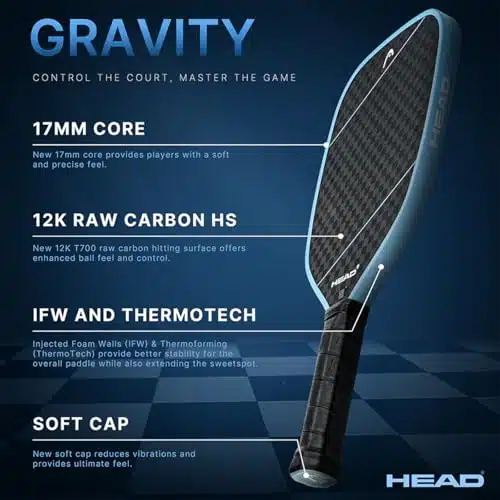 The HEAD Gravity Tour EX introduces an elongated sweetspot shape for enhanced precision, paired with a 12k Raw Carbon surface for maximum control. The soft butt cap ensures added comfort during play, making this paddle ideal for players who prioritize control and a comfortable grip.