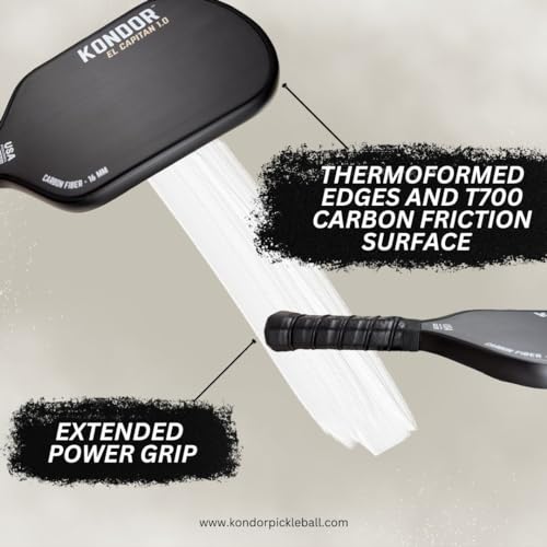 Play like the pros with the all new T700 textured carbon KONDOR El Capitán and El Capitán X edition. Thermoformed unibody injected edges enhance the overall durability and increase the sweet spot. The paddle is an ideal weight of 7.9-8.1 oz which allows you to customize it to your liking and pickleball play needs!
